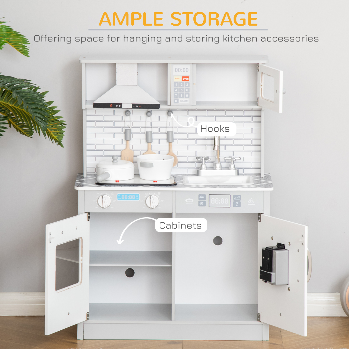 The modern design includes a marble-pattern countertop, plus an electronic ice machine and cooktop with sound and light effects, creating an authentic cooking experience for little chefs.